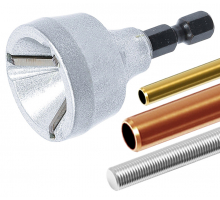 Permet l'ébavurage de l'acier, l'aluminium, l'inox, le cuivre, le zinc, etc. Pour les tiges filetées et tubes Ø3 à 19 mm. Axe de montage 6 pans 1/4".