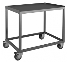 Structure acier mécano-soudée avec revêtement époxy. Plateau avec rebords sur 3 côtés, ouvert sur un côté long. Roues Ø 125 mm à bandage caoutchouc (2 fixes et 2 pivotantes à frein). Capacité de charge maximum : 250 kg.