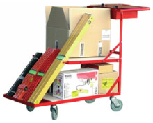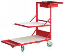 Chariot très rigide avec châssis en tôle d'acier pliée de 3 mm d’épaisseur et 2 plateaux en bois multiplis. Plateau inférieur 1000 x 520 mm. Plateau supérieur (600 x 520 mm) relevable avec griffes pour le calage des objets longs. Tablette de travail avec casier amovible en dessous. 4 roues pivotantes de Ø 125 mm pour une bonne maniabilité.