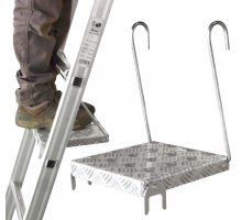 Plateforme amovible se fixant sur toutes les échelles en aluminium avec barreaux de section carrée. Améliore le confort et la stabilité lors de travaux prolongés en hauteur. Permet également de poser ses outils, bacs ou seaux de peinture. Plateforme en aluminium à damier strié antidérapant.
