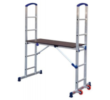 Echafaudage en aluminium à usage domestique. Compact, se déplace facilement grâce à ses 2 roues Ø90 mm. Plateforme avec crochets de sécurité anti-basculement et plateau bois 123 x 40 cm. Peut être fixée sur 2 barreaux de hauteur différente pour rattraper un niveau.
