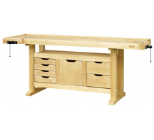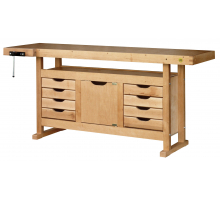 Plateau en lamellé collé épaisseur 25 mm avec ceinture de finition 70 mm et goulotte de rangement pour dégager l'espace de travail en conservant ses outils à portée de main.