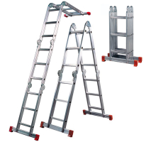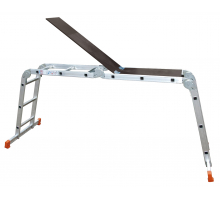 Echelle en aluminium articulée convertible. S'utilise en échelle simple pour atteindre des hauteurs importantes, en échelle avec écarteur de mur, en escabeau pour travailler sans appui et en plateforme grâce au plateau bois proposé en option. Section montants 24 x 60 mm. 6 articulations en acier zingué à blocage automatique. 2 barres stabilisatrices horizontales aux extrémités de l'échelle avec patins antidérapants.
