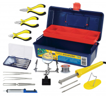 Pour les travaux de soudure de précision en électronique, électricité, modélisme, bricolage. Dans une boîte à outils 300 mm : 1 fer à souder 230 V - 30 W, 3 pinces brucelles, 3 pinces électroniques (universelle, plate et coupante), 6 tournevis horloger (plats et Philips), 1 troisième main avec loupe, 1 bobine de fil d'étain, 1 pompe à dessouder.