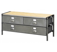Meuble bas avec planche/assise bois intégrée dans le plateau, parfaitement adapté au rangement des chaussures, parapluies, etc.