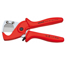 Coupe tubes breveté, équipé de 2 mâchoires, permet la coupe des gaines en plastique annelées Ø18 à 35 mm sans endommager l'intérieur, puis la coupe des tubes PER et multicouches d’un diamètre max de 26 mm. Surfaces de coupe propres, lisses et sans bavures. Ressort d'ouverture et dispositif de verrouillage. Poignées gainées multi-matière. Longueur 210 mm.