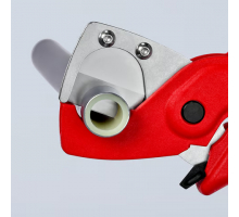 Coupe-tube en acier avec système de démultiplication à crémaillère, idéal pour les tuyauteries en PVC. Bouton d'ouverture latéral facilement accessible. Crochet de verrouillage.