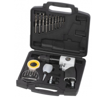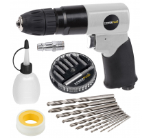 Vitesse de rotation 1800 tr/min. Mandrin automatique Ø 10 mm. Entrée d'air : taraudage 1/4. Livrée en mallette avec 10 forets HSS 1,5 à 6 mm, 1 coffret de 6 embouts de vissage avec porte-embout, un raccord rapide mâle, un rouleau de teflon et une burette à huile vide.