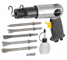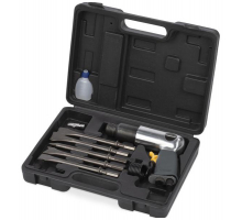 Outil puissant qui offre 3500 coups par minute. Ressort de retenue évitant le contre jeu du marteau. Corps acier avec poignée ergonomique. Entrée d'air : taraudage 1/4. Livré en mallette avec un assortiment de 5 ciseaux et burins, 1 raccord rapide mâle, 1 burette à huile vide.