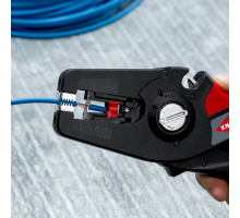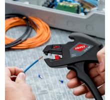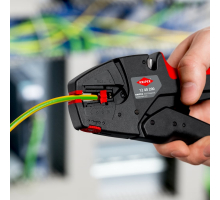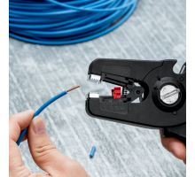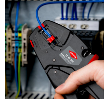 Dénude les conducteurs massifs, multibrins et à brins fins de 0,2 à 6 mm² avec isolation standard sans aucun réglage manuel nécessaire. Avec coupe-câble pour conducteurs massifs jusqu'à 2,5 mm² et multibrins fins jusqu'à 6 mm². Butée de longueur réglable de 6 à 18 mm pour des longueurs de dénudage toujours précises. Outil compact et maniable avec tête fine pour une utilisation dans les zones de travail difficiles d'accès. Travail sans effort, transmission de force maximale grâce à la poignée avec zone de préhension tendre. Corps en plastique renforcé de fibres de verre. Lames durables, peuvent être remplacées lorsqu'elles sont usées.