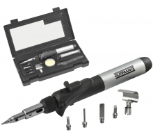 Outil compact et autonome multifonction : Fer à souder, chalumeau, décapeur, façonnage et thermo-rétracteur. Fonctionne au gaz butane (non fourni), se recharge avec toutes les cartouches ordinaires pour briquets. Possède un allumage piézoélectrique. Livré en coffret avec un assortiment de 4 pannes, un couteau de façonnage, un déflecteur à air chaud, une éponge pour nettoyer les pannes, une bobine de fil d’étain et un capuchon de protection. Température fer à souder : 210 - 400°C. Température max flamme : 1300°C. Chauffe très rapidement. Volume du réservoir de gaz : 17ml. Autonomie : 100 min (à moyenne puissance). Longueur 250 mm. Conforme aux normes CE et GS-TUV.